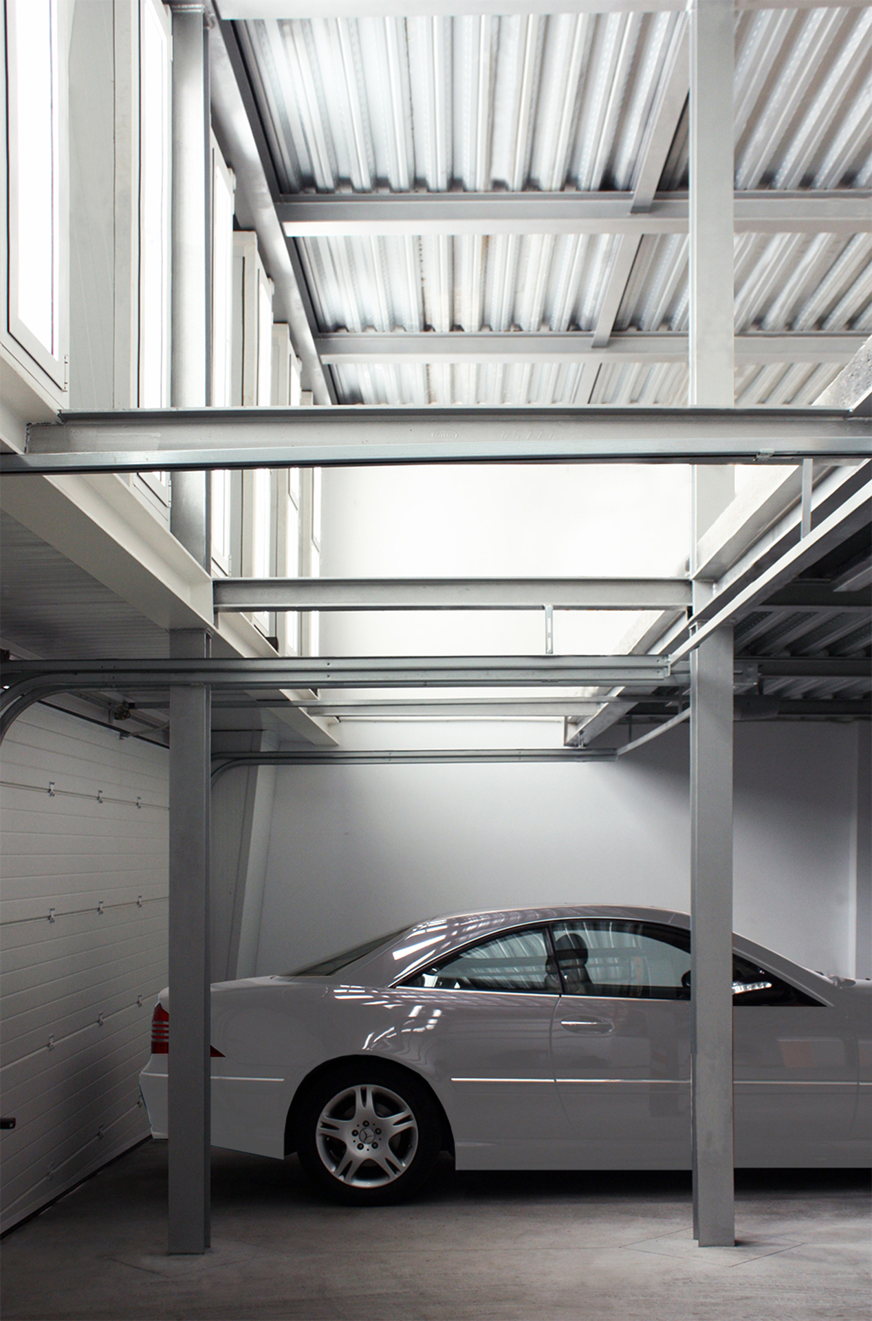 El basamento de garaje y portal se ha resuelto con estructura metálica sobre losa de hormigón armado, la fachada es ventilada, formada por panel sándwich con acabado en aluminio negro al exterior y blanco al interior, como acabado al exterior se colocaron placas de aluminio deployé en color blanco sobre subestructura de aluminio.