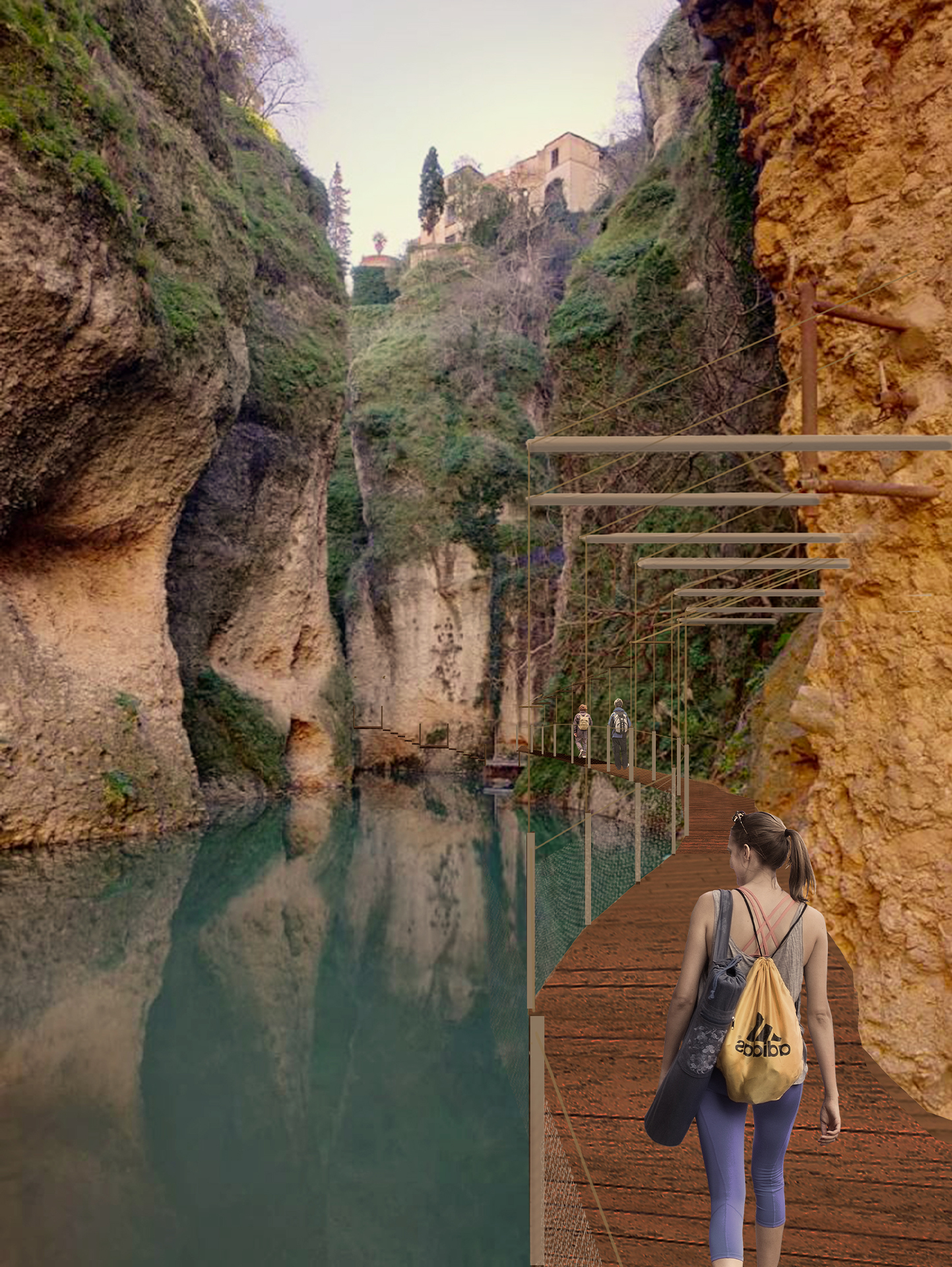 Por otra parte, si bien este proyecto, por su naturaleza podría ser un proyecto puntual, pero cobra mayor importancia y justificación con el objetivo de recuperar otros recorridos históricos en torno a la ciudad que han sido de alguna manera el sustento de esta, como el reconocimiento de la fortaleza y el camino que conectaba los molinos harineros y todo lo que eso conlleva de recuperación la arqueología industrial. Estamos valorando el lugar y la relación de éste con los caminos y recorridos de la ciudad. Todo está relacionado con el monumento, con el Tajo de Ronda.